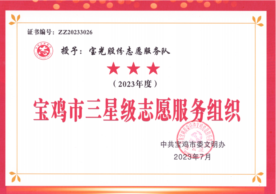 弘揚(yáng)志愿精神,彰顯擔(dān)當(dāng)作為。寶光股份志愿服務(wù)隊(duì)將以榮獲“寶雞市三星級志愿服務(wù)組織”為契機(jī),深入學(xué)習(xí)習(xí)近平新時(shí)代中國特色社會(huì)主義思想,繼續(xù)弘揚(yáng)志愿服務(wù)精神,進(jìn)一步拓寬服務(wù)領(lǐng)域,創(chuàng)新服務(wù)方式,打造服務(wù)品牌,在志愿服務(wù)工作中再接再厲、再添措施,為文明城市創(chuàng)建增光添彩。